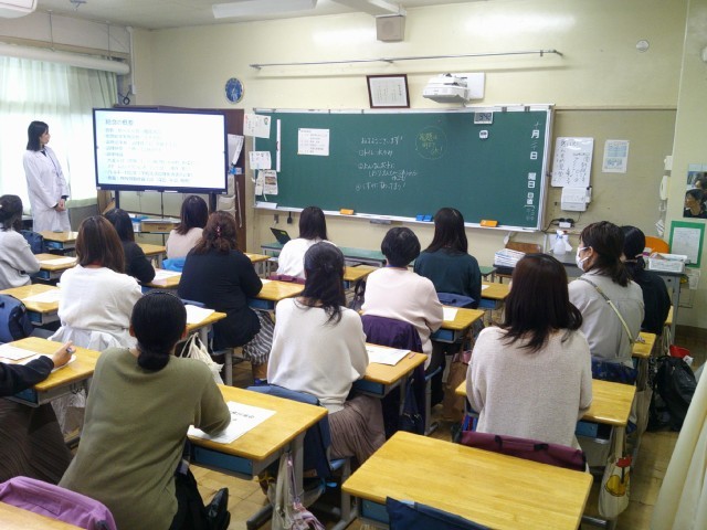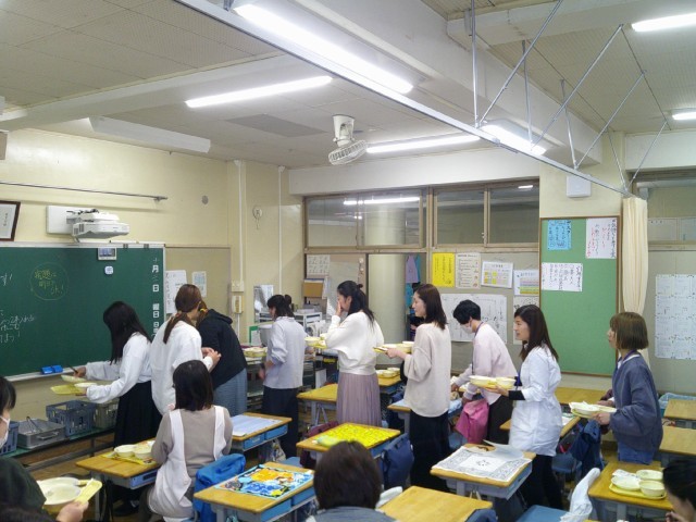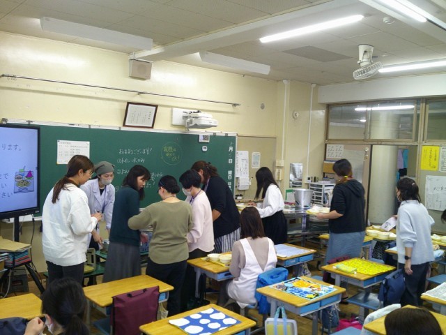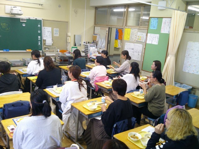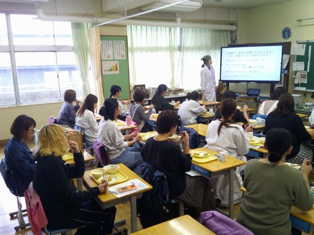 給食試食会の様子です。子どもたちと同じメニューを食べていただきました。
