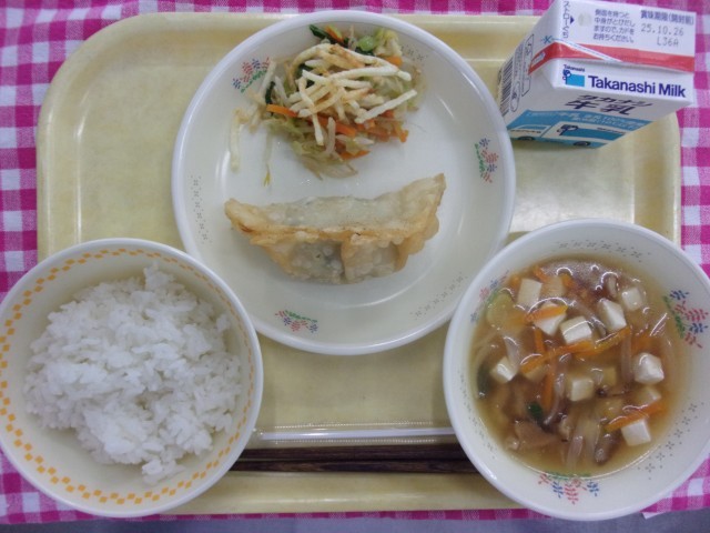 10月21日の給食は、牛乳・ご飯・ジャンボ餃子・じゃがいも入りナムル・春雨スープです。