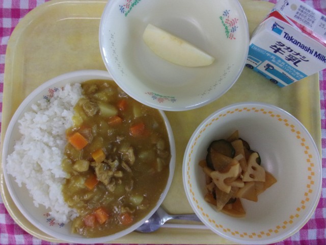 今日の給食は、牛乳・アルファ化米入りご飯・コロコロカレー・手作り福神漬け・りんごです。