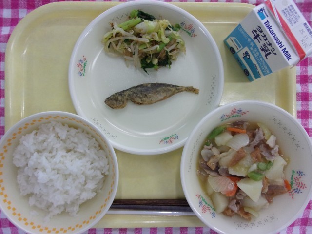 今日の給食は、ご飯・ゆず塩肉じゃが・小あじの磯部揚げ・おひたしです。