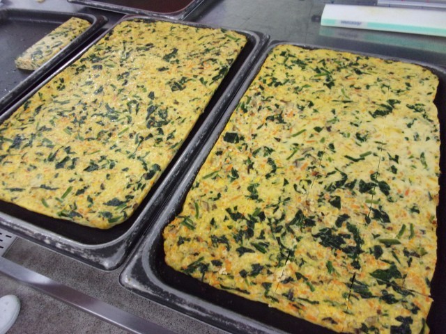 今日の給食は、牛乳、ゆかりご飯、千草焼き、青菜とコーンのおひたし、野菜たっぷり味噌汁です。