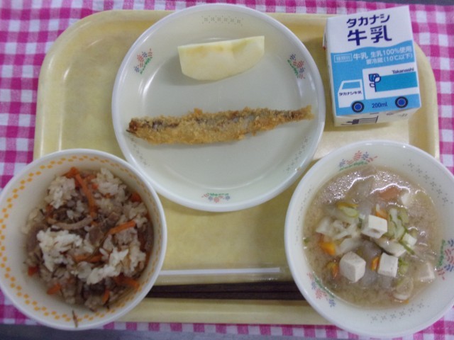 今日の給食は牛乳、シシジューシー、ししゃものフライ、イナムドゥチ、果物(りんご)です。