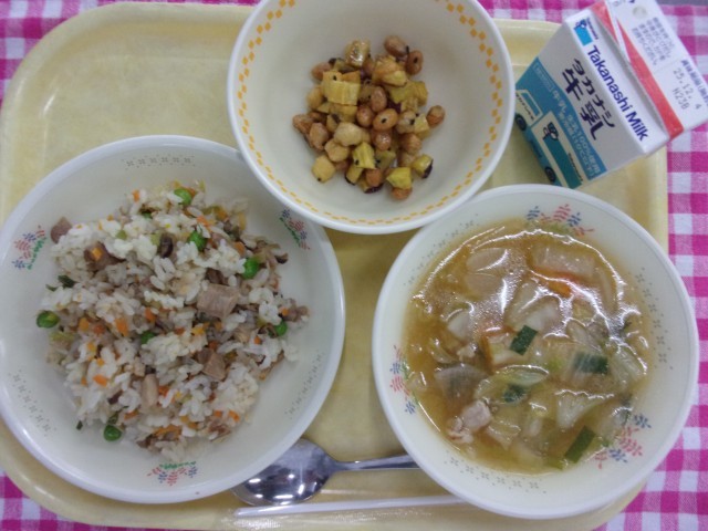 今日の給食は牛乳、焼き豚チャーハン、豆かりんとう、大根入りキムチスープです。