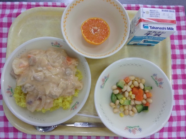 今日の給食は牛乳、ターメリックライス&具だくさんソースがけ、豆入りコロコロサラダ、菊花みかんです。