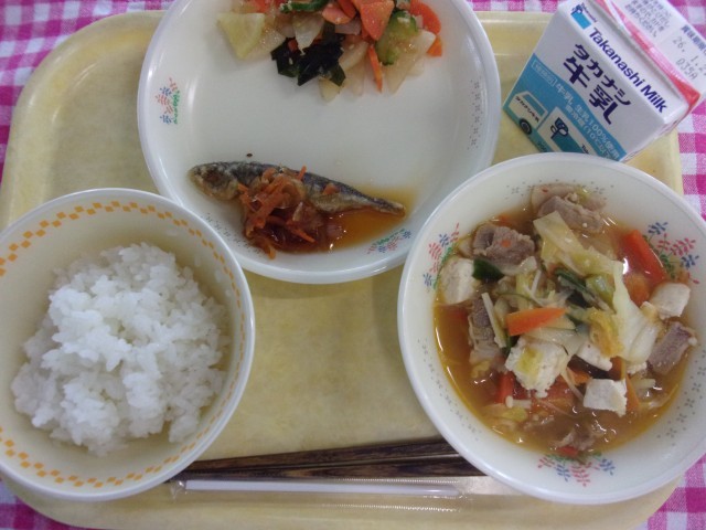 今日の給食は、牛乳、ご飯、キムチ豆腐、小あじの南蛮漬け、わかめサラダです。