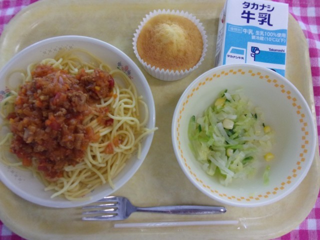 2月2日(月)の給食は、牛乳、スパゲティミートソース、フレンチサラダ、オレンジケーキです。