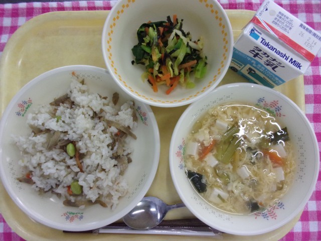 今日の給食は、牛乳、鶏ごぼうピラフ、磯香和え、むらくも汁、です。
