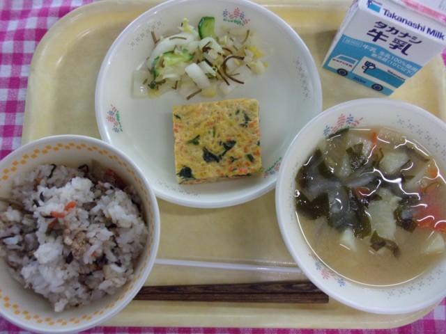 今日の給食は、牛乳、ひじきご飯、千草焼き、白菜の塩昆布漬け、じゃがいもの味噌汁、です。