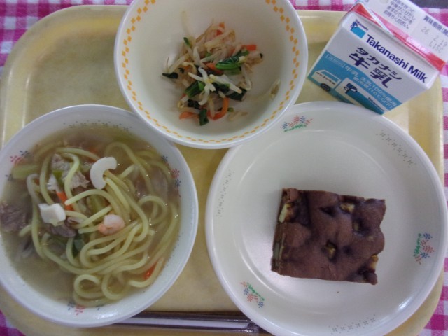 今日の給食は、牛乳、ちゃんぽん麺、野菜の辛子和え、ブラウニー、です。