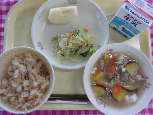 今日の給食は、牛乳、切り干し大根ご飯、糸寒天のごま酢和え、さつま汁、りんご、です。