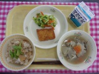 今日の給食は、牛乳、五穀ごはん、魚のピザ焼き、野菜のゆかり和え、春雨とたまごのスープ、です。