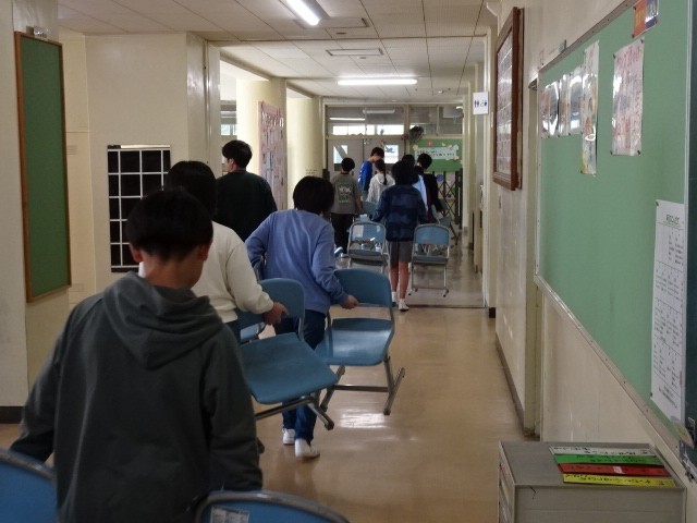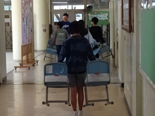 1年生はいよいよ一人での初登校です。教室に入ってランドセルはどこにしまうのかな?筆箱や手さげはどこかな?いろいろ迷うところもありますが、担任だけでなく、補助の教職員や6年生が来て優しく教えてくれます。心配なく登校してください。ほかには昨日の入学式で使った椅子を朝の時間を使って6年生が片付けてくれていました。