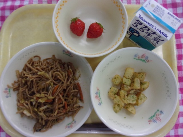 今日の給食は、牛乳、焼きそば、フライドポテト、いちご、です。