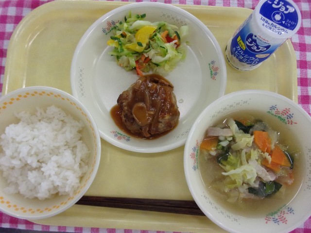 今日の給食は、発酵乳、ご飯、ハンバーグケチャップソース、カラフルサラダ、麦入り野菜スープ、です。
