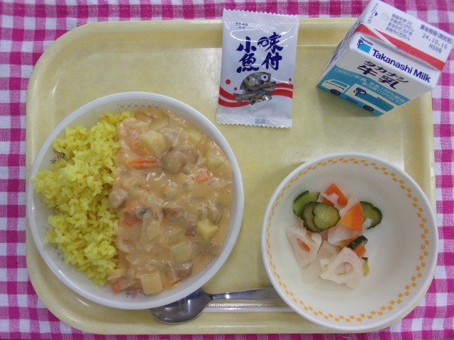 今日の給食は、牛乳・ターメリックライス・具だくさんソースかけ・野菜ピクルス・いりこです。