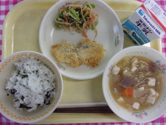昨日の給食は、牛乳・わかめご飯・たらのパン粉焼き・ごまあえ・具だくさん味噌汁です。
