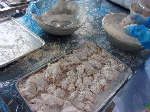 1枚1枚丁寧に粉付けをして、一度に揚げる数を少なくしているので、カリッとおいしく出来上がります。