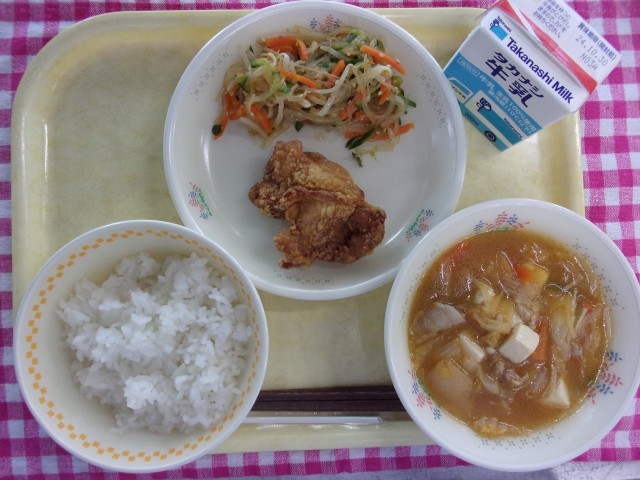 今日の給食は、牛乳・ご飯・鶏のから揚げ・春雨入りナムル・スンドゥブです。