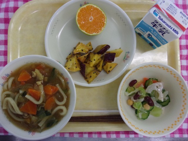 今日の給食は、牛乳・カレーうどん・豆と根菜のサラダ・大学いも・菊花みかんです。