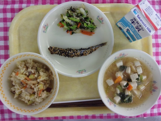 今日の給食は、牛乳・秋味ご飯・ししゃものごま焼き・磯香和え・豆腐の味噌汁です。