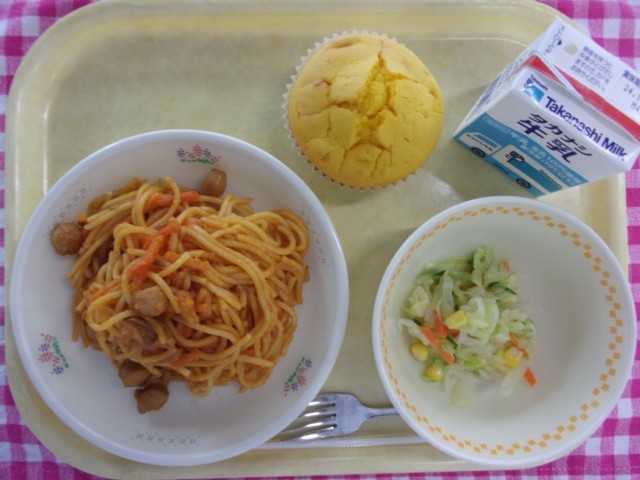 今日の給食は、牛乳・スパゲッティナポリタン・コールスローサラダ・ハロウィンケーキです。