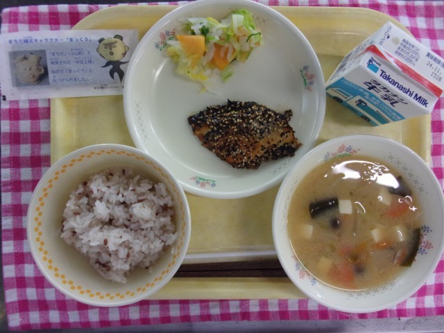今日の給食は、牛乳・古代米入りご飯・さばの縄文焼き・柿サラダ・わかめ入り味噌汁・「まっくう」のりです。