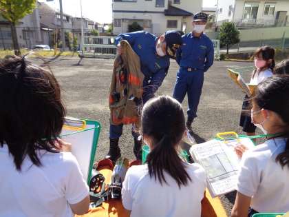 町田消防署成瀬分署の消防士さんが、今年度は学校にポンプ車と一緒においでくださいました。3年生は事前に、これまでの社会科で学びを生かして、聞きたいことをシンキングツールを使ってまとめました。ピカピカの消防車を前に、少し緊張気味です。実際の消防服やポンプの仕組みをたくさん質問していました。20キロ以上の装備をして、現場で働くのは、お一人お一人が「人の役に立ちたい」という強い思いがあるからだと、しっかりと伝わりました。