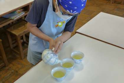 初めての実習にむけて、家庭科室の使い方を学び、身支度のととのえ方を事前に学んで臨みました。ガスコンロのセットでは、元栓に悪銭苦闘しましたが、火を付けることができました。一人で3杯のお茶を入れ、濃さの調節をします。茶葉が開くまで1分程度待ちますが、子供たちは数を数えていました。自分で丁寧に入れた日本茶は、格別だったようです。5・6年で使用したお茶は、静岡県茶業会議所からいただいた「静岡茶」です。