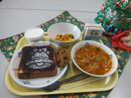 2学期最後の給食は「クリスマス献立」です。みんなとっても楽しみにしていました。400枚近いパンに作業するのは大変だったかと思いますが、3種類のうち、どの図柄が配られるかはお楽しみです。チキンは、サクサク、ジューシーで美味しいですよ。アイスを時間差で配るので、みんなで協力して素早く配膳をしましょう。