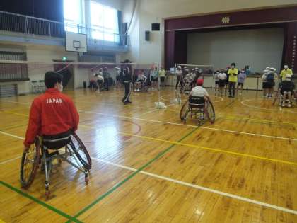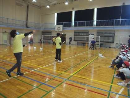 競技用の車椅子体験は、みんな初めてとは思えないほど、上手に操作をしていて驚かれました。まっすぐ進み、コーンを過ぎたらターンをして戻り、所定の位置に停めるという操作を6台の競技用車椅子で挑戦しました。続いて、梶原選手と町田市のバドミントン連盟の方が、デモストレーションを見せてくださいました。パシッと響くシャトルの音や相手がダブルスでもすべての球に軽々と対応してしまう梶原選手の素晴らしさに目を見開いていました。その後、全員がバドミントンでラリー体験をしたり、質問に答えていただいたりとあっという間の45分間でした。