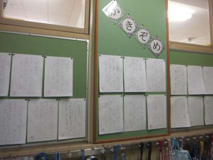 3学期が始まり3日目。既に掲示板には、児童の学習成果物や立ち止まって見てほしいものなどが貼られています。1・2年生は硬筆の書き初めを掲示して見合っています。階段の踊り場には、この季節に関した掲示を先生方が作成しました。