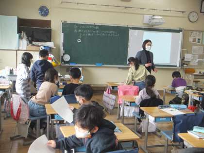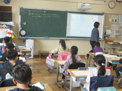 「100のまとまり」に注目して大きい数を考える授業でした。これまで学習した「位取り表」「図」「カード」などを使って自分の考えを友達に説明しました。「もと」という算数ではとても大切な考え方の基礎です。
