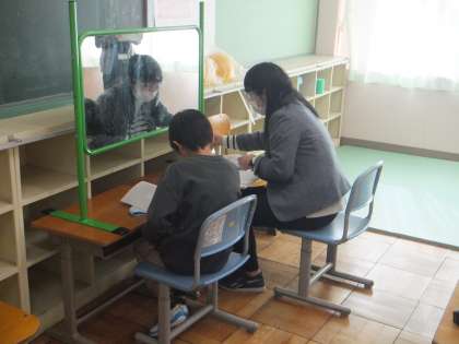 3学期のことばの授業は、13日から始まっています。始めは、自由会話です。自分の感じたことなどを先生にお話をします。その後、拡大鏡で自分の舌の動きを確認したり、模型で舌の力の抜き方を確かめたりしました。