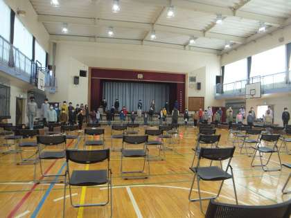 なかなか全員が揃っての練習はかないませんが、少しずつねらいを変えて、練習をしています。間隔を広くとっているため、声を揃えることがとても難しいと、どの学年の先生もおっしゃっています。マイクを含めた音響機械を効果的に使っています。