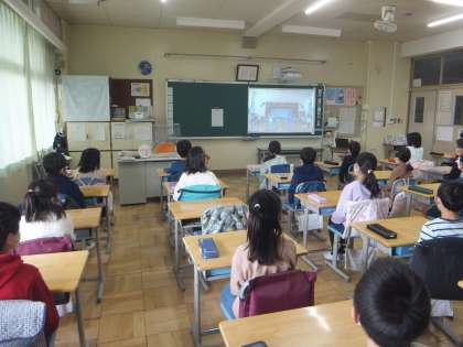 体育館で学年入れ替えで、出し物を6年生に見せる予定でしたが、すべてオンラインに切り替えました。5・4年生の代表委員が、家庭科室から進行します。ライブで伝えたいという思いがありましたが、撮影の工夫により、各学年の「ありがとう」と「おめでとう」はしっかり伝わりました。
