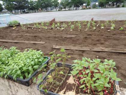 年に2回、花壇の植え替えをするのですが、今回は夏の花壇づくりです。町田市の花のサルビアの苗が例年より多いように感じます。6時間目の委員会活動をスムーズにすすめるために、ボランティアコーディネーターさんが、支度をしてくださっています。苗の間隔をとったり、花の種類を確認したりしてくださいました。雨が降らないうちに、子どもたちが植えられるといいね、と話しています。