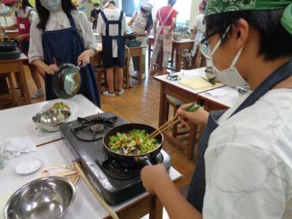 6年生にとって、初めての本格的な調理実習です。何度もシミュレーションした工程を、手際よくすすめています。中には「炒めるって、暑いな。」という声もあります。全工程を一人で行う「一人実習」は、中学・高校でも増えています。
