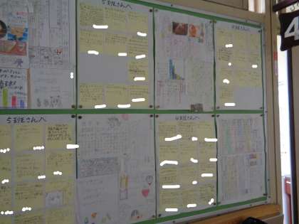 学び合い【4年】(7/8) 公開日 2022/07/08 更新日 2022/07/08 お知らせ 4年の廊下には、班ごとに作成した新聞が掲示されています。その1枚1枚に、他の班の人たちからのメッセージがついています。工夫やよいところなど、きちんと見つけています。まとめて終わり、ではなく、自分に生かしていこうとするところが大切ですね。