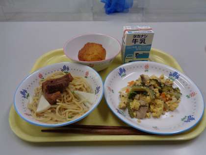 今日の献立は「かぼちゃのサーターアンダギー」「ソーキそば」「ゴーヤチャンプルー」に牛乳です。ソーキそばの豚の角煮は、給食室の大きな釜で柔らかく、そしてじっくり煮込まれています。サーターアンダギーは子供たちのげんこつくらいの大きさです。家庭の鍋では揚げにくい大きさですが、おいしくカラッと揚がっています。かぼちゃの黄色がとてもきれい。ゴーヤチャンプルーは夏の味!ですが、ゴーヤの苦味が残っていますので、もりもり食べてくれるとよいなと思っています。ごちそうさまでした!
