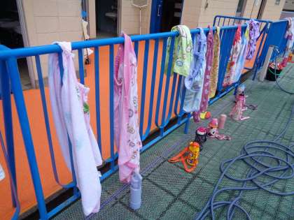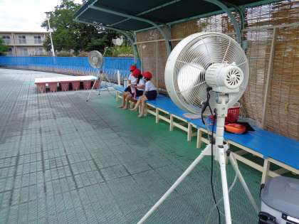 水泳指導や水遊びであっても、熱中症対策は欠かせません。今年度もプールサイドに水筒を持ち込んで、指導の合間に声かけして水分補給をしています。また、見学者用のよしずの下にミストの出るファンを2台購入しました。