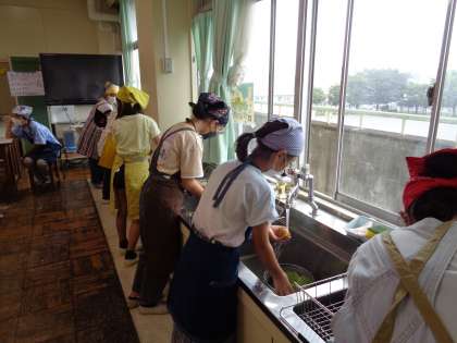 5年生の本格的な調理実習です。2学期分を前倒しで実施して、「カラフルゆで野菜サラダ」を調理します。各自、じゃがいも、ニンジン、キャベツをゆで、ドレッシングをかけて試食することを45分で行います。野菜を洗うところから、「これは拭くの?」と質問が出ています。