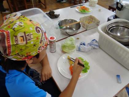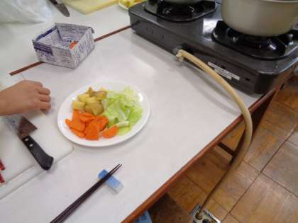 ニンジンとじゃがいもは水からゆでました。その茹で汁でキャベツをゆでました。お家から持ってきたドレッシングなどの調味料をかけて、いただきます。「う、うまい!」という声があがります。夏休み中も実践してみましょう。ちなみに、じゃがいもの芽かきは