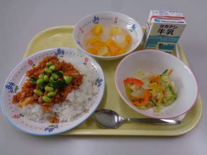 今日は、本土復帰50周年の沖縄県の郷土料理のタコライスです。タコライスはメキシコの「タコス」を参考に生まれた料理です。ピリ辛のチリパウダーが入ったミートソースと生野菜をごはんにのせて食べます。今日は、ごはんにミートソースと枝豆ときゅうりをのせて彩りもさらにプラスしています。キャベツ、ニンジン、きゅうり、赤パプリカ、黄パプリカが入ったカラフルサラダもとてもきれいな色ですね。1学期最後なのでデザートはナタデココが入ったフルーツポンチです。みんな、美味しく食べてくれるといいなと思っています。
