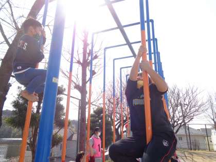 こちらは登り棒です。ブロンズカードでは、1番上にタッチしておりることになっています。裸足になって上っていく子が多いですが、途中手のしびれをほぐしながら…など自分なりの攻略法があるようです。
