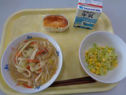 今日の献立は、「白ごまタンタンうどん」「キャベツとコーンのサラダ」に「ベイクドチーズケーキ」です。チーズケーキは子供たちの、アンケートでデザート部門のランキングに入っていました。給食室の手作りの「ベイクドチーズケーキ」は、ふわっと口溶け軽く、ヨーグルトの酸味と生クリームやクリームチーズの濃厚さがマッチしていて、とても美味しいです。卵のアレルギーのある子供たちも食べられるように、卵除去のチーズケーキも作ってくれました。「白ごまタンタンうどん」は、ラー油や赤辛味噌が少しピリッとくるお肉と野菜たっぷりのうどんでした。しっかり食べられましたか?