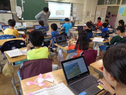 都道府県から1つ選び、さまざまな特徴を調べ、魅力を発信する学習として、新聞形式にまとめた4年生。今度は、それを基にして、画像などを取り込みスライドを作成しています。画面の切替について、先生から設定方法を教わり、自分のスライドを調整していました。