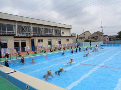 しっかりと水をかくという腕の動きや肩の動きを感じながら、速く歩く競争をしています。