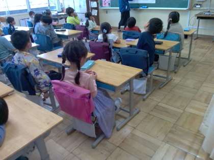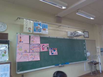 2−1 月曜日に行う1年生との学校探検のための案内板と、初めての席替え直後の様子です。