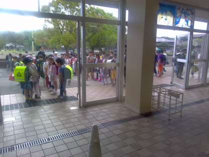 8時ちょっと前の昇降口の様子です。 きちんと並んで待っている姿がすばらしいです。