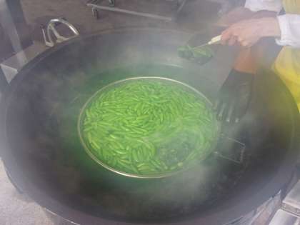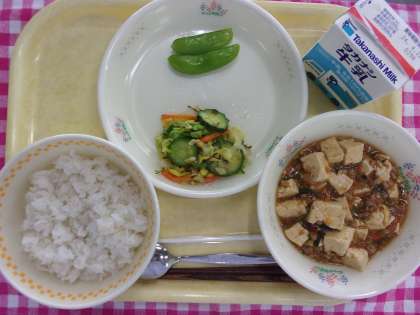今日の給食は、麦ごはん、マーボー豆腐、元気サラダ、ゆでスナップえんどうです。スナップえんどうは、今が旬です。たっぷりのお湯でゆで、きれいな色に仕上がりました。さやまで食べられることをこどもたちに伝えると、驚いている子もいました。